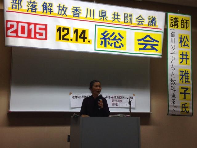 総会終了後、「香川の子どもと教科書ネット」代表の松井雅子氏より「香川県の子どもたちの教科書はどうなっているの?〜育鵬社・歴史・公民教科書に反対の声をあげていこう〜」と題して記念講演が行われました。今回も高松北中学校で採択された育鵬社の歴史、公民の教科書の問題点、育鵬社の教科書採択反対の運動の経過等について、1時間半以上にわたり、とても熱く話されました。