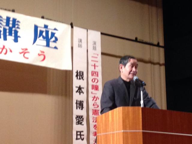 1月17日 第2回2015年度憲法講座 高松市の香川県社会福祉総合センターにおいて、10時より根本博愛四国学院大学名誉教授(憲法)による「二十四の瞳から見た憲法」をテーマにした講演会が開催されました。根本先生は壺井栄の『二十四の瞳』に描かれた反戦の思い、船坂小学校の樫本先生の平和教育の実践を紹介され、そして共生の思いを語られました。