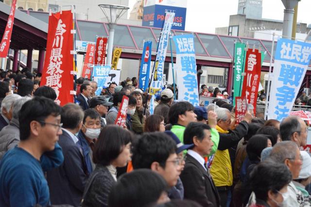 3月19日(土)戦争法廃止をめざす香川県民集会 戦争をさせない香川1000人委員会、香川県平和労組、連合香川など多くの団体が呼びかけ、高松瓦町駅周辺で決起集会とピースウォークを行いました。反対運動の中心的な役割を果たしている若い力であるSEALDsからも参加してくれました。日教組香川からも嶋村委員長はじめ多くの仲間が参加しました。また、同日、東京では日比谷野外音楽堂にて、「戦争法廃止!安倍内閣退陣!3.19総がかり行動」が開催されました。
