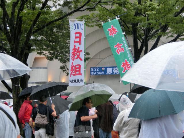 脱原発を訴える大規模な市民集会「さようなら原発 さようなら戦争 9.22大集会」が22日、東京都渋谷区の代々木公園で開かれ、約9,500人(主催者発表)が集まりました。集会は「さようなら原発」一千万署名市民の会が主催、日教組香川からも参加しました。集会では、ルポライターの鎌田慧さんが「もんじゅの廃炉は核燃料の再処理と原発再稼働を止めるひとつの出発点で、原発政策の転換の始まりです」と呼びかけ、参加者は「原発いらない」「戦争法は今すぐ廃止」とシュプレヒコールをあげ、脱原発と戦争反対を訴えました。残念ながら強い雨のため、デモは中止になりましたが、改めて「原発反対」「戦争反対」の訴えを続けていくことの重要性を確認した集会でした。