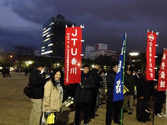 3月8日(水)2017春季生活闘争勝利3.8総決起集会 連合香川・平和労組会議・各地区労共催で、午後6時30分より高松中央公園と丸亀市民ひろばの県内2会場で開催されました。3月にしては寒い一日でしたが、仕事を終えた各産別の組合員が集まり、春闘勝利をめざした決意表明が行われました。高松では、集会終了後、三越前までデモ行進を行いました。
