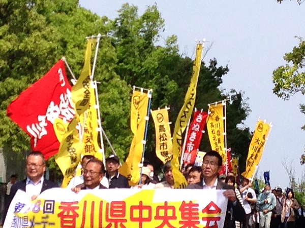 「長時間労働の撲滅 ディーセント・ワークの実現 今こそ 底上げ、底支え、格差是正の実現を!」をメインスローガンに、県下最大規模の香川県メーデー中央集会が午前9時よりサンポート高松多目的広場で開催されました。進藤連合香川会長の力強い挨拶の後、浜田知事、大西高松市長、大山さぬき市長、民進党玉木衆議院議員、社民党高田代表より激励の挨拶がありました。スローガン・特別決議を採択し、メーデー宣言の後、デモ行進に移りました。最後は抽選会を行いメーデー集会を終えました。また、中讃東地区集会は9時30分より瀬戸大橋記念公園マリンドームで、中讃西地区集会は9時30分より丸亀市民ひろばで、西讃地区集会は10時より観音寺市民会館で開催されました。小豆島地区集会は4月30日9時30分より安田・植松馬場で開催されました。