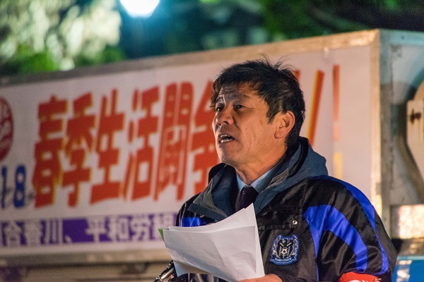 3月7日(水)2018春季生活闘争3.7香川県総決起集会 連合香川、平和労組会議、連合香川東地協、各地区労主催により、午後6時30分より高松市中央公園において開催されました。日教組香川からもなかまが6人参加し、嶋村委員長が学校現場のブラックな働き方、多忙な実態を訴え、力強く決意表明をしました。その後、高松三越前までデモ行進を行いました。