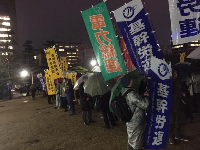 3月6日(水)2019春季生活闘争勝利総決起集会 連合香川、平和労組会議、連合香川東地協、各地区労主催による「2019春季生活闘争勝利総決起集会」が、降りしきる雨の中、多くの組合員が集まり、午後6時30分より高松市中央公園において開催されました。また、三越前までのデモ行進では、法改正となった長時間勤務労働の罰則規定など、広く街頭で訴えました。