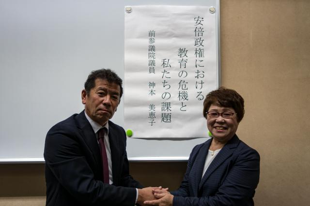 こうした中、午後6時より香川県社会福祉総合センターにおいて、「民主教育をすすめる香川県民会議」総会・講演会が開催されました。講演会では小学校教員出身の神本美恵子前参議院議員から「安倍政権における教育の危機と私たちの課題〜18年間の議員活動を振り返って〜」と題して、様々な教育問題を取り上げられ、安倍政権がめざす国家主義・市場原理と自己責任の教育政策が進められている危険性を強く訴えられました。