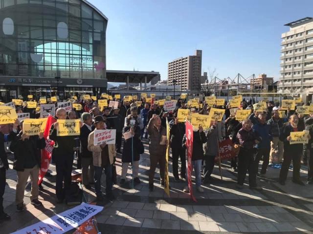 そこで、四国ブロック平和フォーラム・社民党四国ブロックさらに平和憲法を生かす香川県民の会などで、「日米共同訓練の中止」を求め、午後1時よりJR高松駅前ひろばにおいて抗議行動を行いました。しかし、翌日12月9日(月)に、私たちの強い抗議を無視して、「オスプレイ」が市街地を通過し、国分台で軍事演習を行いました。