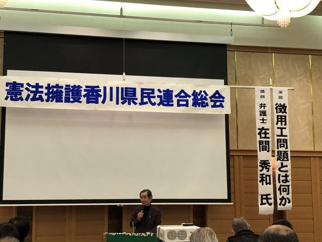 このような中、レクザムホールにおいて、午前9時半から護憲香川総会が開かれ、引き続き大阪弁護士会の在間秀和氏による「“徴用工問題”とは何か?」と題した記念講演会が開催されました。その後、三越前まで移動し、平和を守るための街頭行動が行われました。