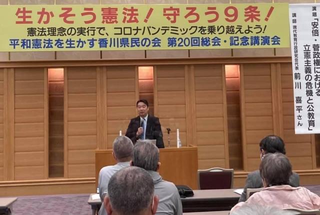 5月3日(月)「平和憲法を生かす香川県民の会」第20回総会・記念講演会 今年5月3日に憲法施行74周年を迎え、「平和憲法を生かす香川県民の会」として、第20回総会及び記念講演会が、午前9時半からレクザムホール多目的大会議室「玉藻」において、コロナ感染対策を取りながら、たくさんの参加者を迎え、開催されました。 今回、記念講演会は加計問題の疑惑を国会で証言したあの前川喜平氏(現代教育行政研究会代表・元文部科学省事務次官)が「安倍・菅政権における立憲主義の危機と公教育」と題して、鋭く政権批判をされ、ユーモアも交えながら講演されました。